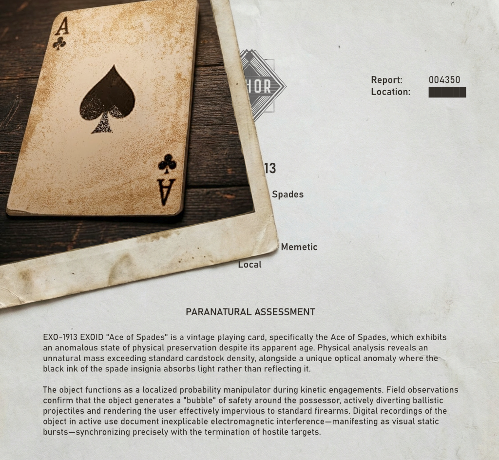 During a routine containment rotation, researcher Nortar reported a visual anomaly regarding EXO-1913 ("Ace of Spades"). While transporting the NVECC unit, Nortar noted that the corner indices of the card appeared to shift from "Spades" to "Clubs" for approximately three seconds before reverting.